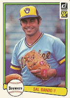 I'm not certain if the folks over at Donruss were trying to portray the sibling dynamic between the Bando brothers when they released their 1982 set. The set would feature Sal's final card and Chris's first.